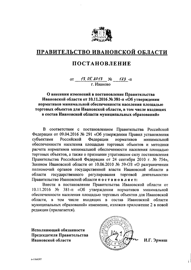 Постановление Правительства Ивановской области от 17.05.2017 N 183-п "О внесении изменений в постановление Правительства Ивановской области от 10.11.2016 N 381-п "Об утверждении нормативов минимальной обеспеченности населения площадью торговых объектов для Ивановской области, в том числе входящих в состав Ивановской области муниципальных образований" (вместе с "Нормативами минимальной обеспеченности населения площадью торговых объектов местного значения для городских округов и поселений Ивановской области")