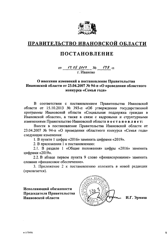 Постановление Правительства Ивановской области от 17.05.2017 N 179-п "О внесении изменений в постановление Правительства Ивановской области от 23.04.2007 N 94-п "О проведении областного конкурса "Семья года"