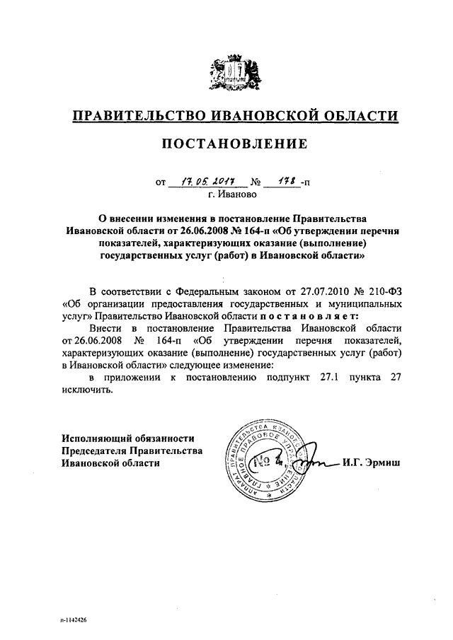Постановление Правительства Ивановской области от 17.05.2017 N 178-п "О внесении изменения в постановление Правительства Ивановской области от 26.06.2008 N 164-п "Об утверждении перечня показателей, характеризующих оказание (выполнение) государственных услуг (работ) в Ивановской области"