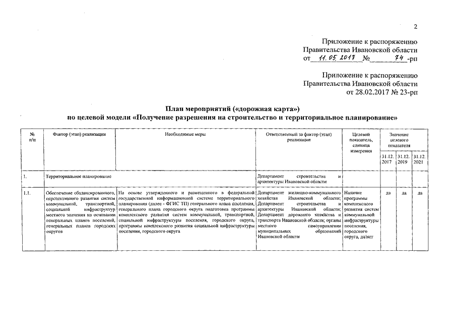 Распоряжение Правительства Ивановской области от 11.05.2017 N 74-рп "О внесении изменения в распоряжение Правительства Ивановской области от 28.02.2017 N 23-рп "Об утверждении плана мероприятий ("дорожной карты") по целевой модели "Получение разрешения на строительство и территориальное планирование"