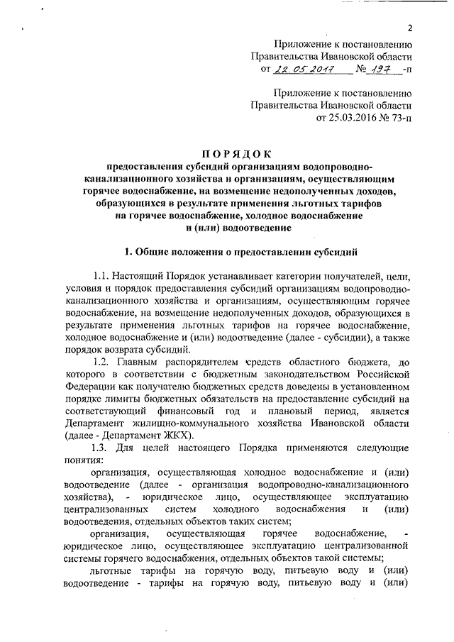 Постановление Правительства Ивановской области от 22.05.2017 N 197-п "О внесении изменения в постановление Правительства Ивановской области от 25.03.2016 N 73-п "О предоставлении субсидий организациям водопроводно-канализационного хозяйства и организациям, осуществляющим горячее водоснабжение, на возмещение недополученных доходов, образующихся в результате применения льготных тарифов на горячее водоснабжение, холодное водоснабжение и (или) водоотведение" (вместе с "Порядком предоставления субсидий организациям водопроводно-канализационного хозяйства и организациям, осуществляющим горячее водоснабжение, на возмещение недополученных доходов, образующихся в результате применения льготных тарифов на горячее водоснабжение, холодное водоснабжение и (или) водоотведение")