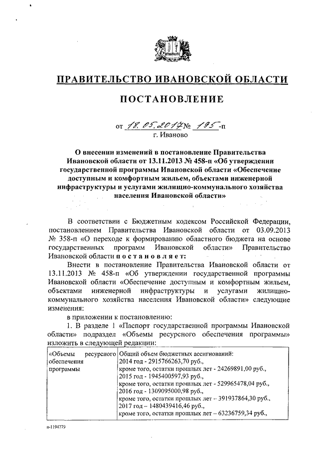 Постановление Правительства Ивановской области от 18.05.2017 N 195-п "О внесении изменений в постановление Правительства Ивановской области от 13.11.2013 N 458-п "Об утверждении государственной программы Ивановской области "Обеспечение доступным и комфортным жильем, объектами инженерной инфраструктуры и услугами жилищно-коммунального хозяйства населения Ивановской области" (вместе с "Порядком предоставления и распределения субсидий бюджетам муниципальных образований на обеспечение мероприятий по формированию современной городской среды")