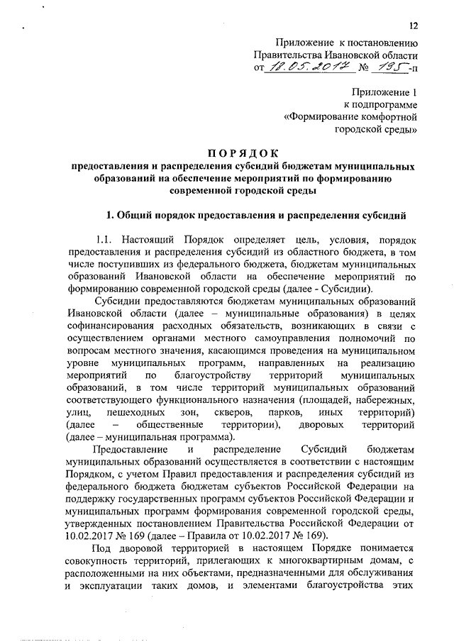 Постановление Правительства Ивановской области от 18.05.2017 N 195-п "О внесении изменений в постановление Правительства Ивановской области от 13.11.2013 N 458-п "Об утверждении государственной программы Ивановской области "Обеспечение доступным и комфортным жильем, объектами инженерной инфраструктуры и услугами жилищно-коммунального хозяйства населения Ивановской области" (вместе с "Порядком предоставления и распределения субсидий бюджетам муниципальных образований на обеспечение мероприятий по формированию современной городской среды")