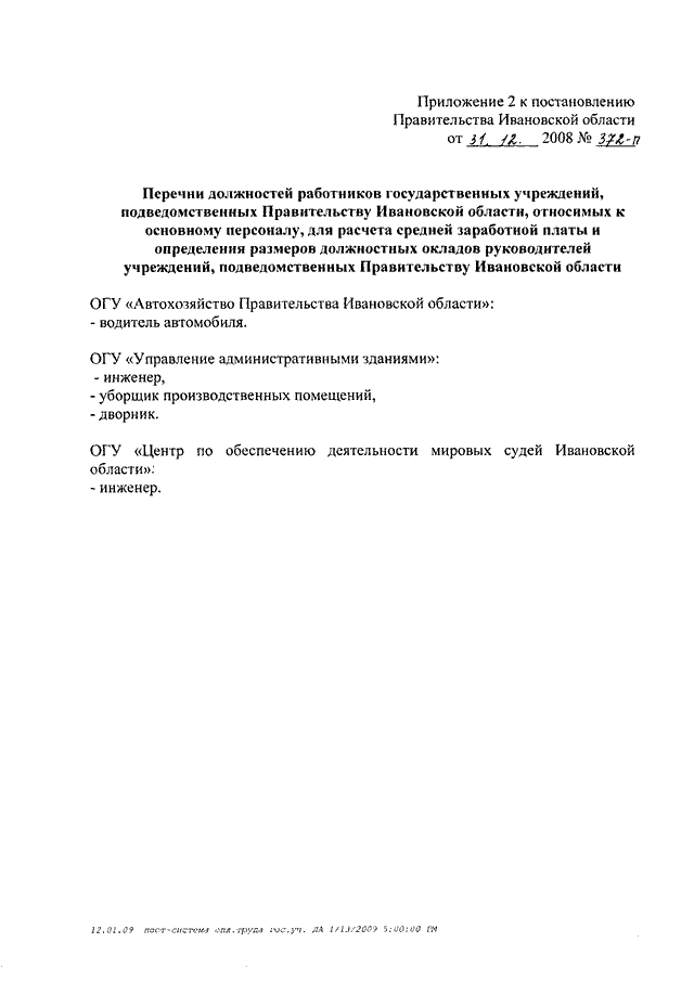 Постановление Правительства Ивановской области от 31.12.2008 N 372-п "О системе оплаты труда работников государственных учреждений, подведомственных Правительству Ивановской области" (вместе с "Типовым положением об оплате труда работников государственных учреждений, подведомственных Правительству Ивановской области", "Перечнями должностей работников государственных учреждений, подведомственных Правительству Ивановской области, относимых к основному персоналу, для расчета средней заработной платы и определения размеров должностных окладов руководителей учреждений, подведомственных Правительству Ивановской области")