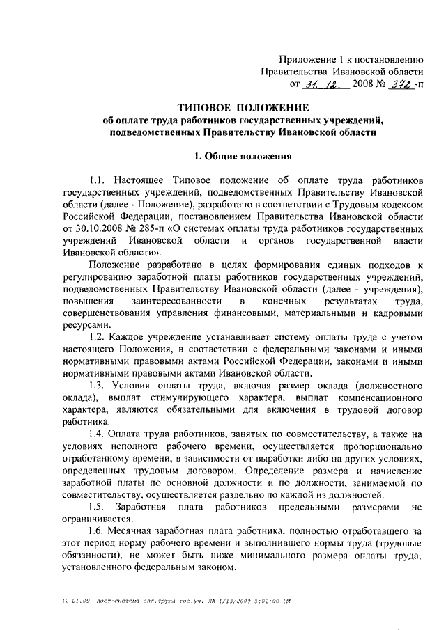 Постановление Правительства Ивановской области от 31.12.2008 N 372-п "О системе оплаты труда работников государственных учреждений, подведомственных Правительству Ивановской области" (вместе с "Типовым положением об оплате труда работников государственных учреждений, подведомственных Правительству Ивановской области", "Перечнями должностей работников государственных учреждений, подведомственных Правительству Ивановской области, относимых к основному персоналу, для расчета средней заработной платы и определения размеров должностных окладов руководителей учреждений, подведомственных Правительству Ивановской области")