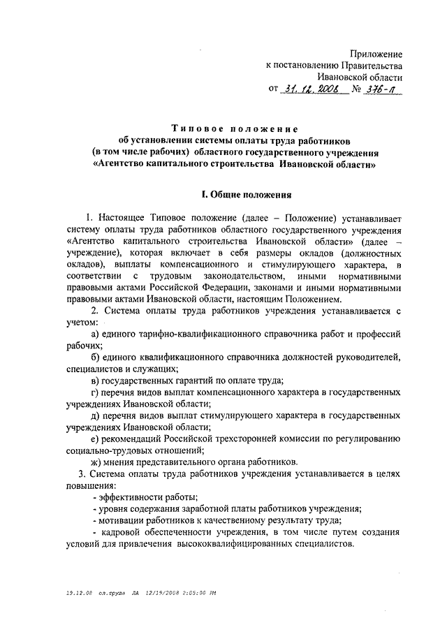 Постановление Правительства Ивановской области от 31.12.2008 N 376-п "О системе оплаты труда работников областного государственного учреждения "Агентство капитального строительства Ивановской области" (вместе с "Типовым положением об установлении системы оплаты труда работников (в том числе рабочих) областного государственного учреждения "Агентство капитального строительства Ивановской области")