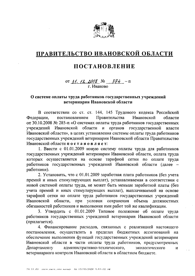 Постановление Правительства Ивановской области от 31.12.2008 N 374-п "О системе оплаты труда работников государственных учреждений ветеринарии Ивановской области" (вместе с "Типовым положением об оплате труда работников государственных учреждений ветеринарии Ивановской области")