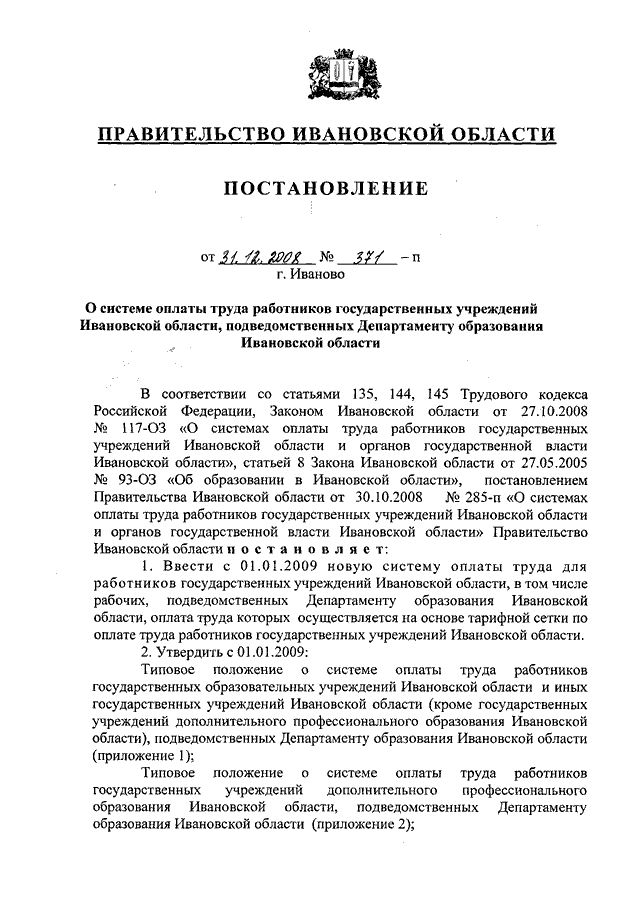 Постановление Правительства Ивановской области от 31.12.2008 N 371-п "О системе оплаты труда работников государственных учреждений Ивановской области, подведомственных Департаменту образования Ивановской области" (вместе с "Типовым положением о системе оплаты труда работников государственных образовательных учреждений Ивановской области и иных государственных учреждений Ивановской области (кроме государственных учреждений дополнительного профессионального образования Ивановской области), подведомственных Департаменту образования Ивановской области", "Типовым положением о системе оплаты труда работников государственных учреждений дополнительного профессионального образования Ивановской области, подведомственных Департаменту образования Ивановской области", "Перечнем должностей работников, относимых к основному персоналу, для расчета средней заработной платы и определения размеров должностных окладов руководителей государственных учреждений Ивановской области, подведомственных Департаменту образования Ивановской области")