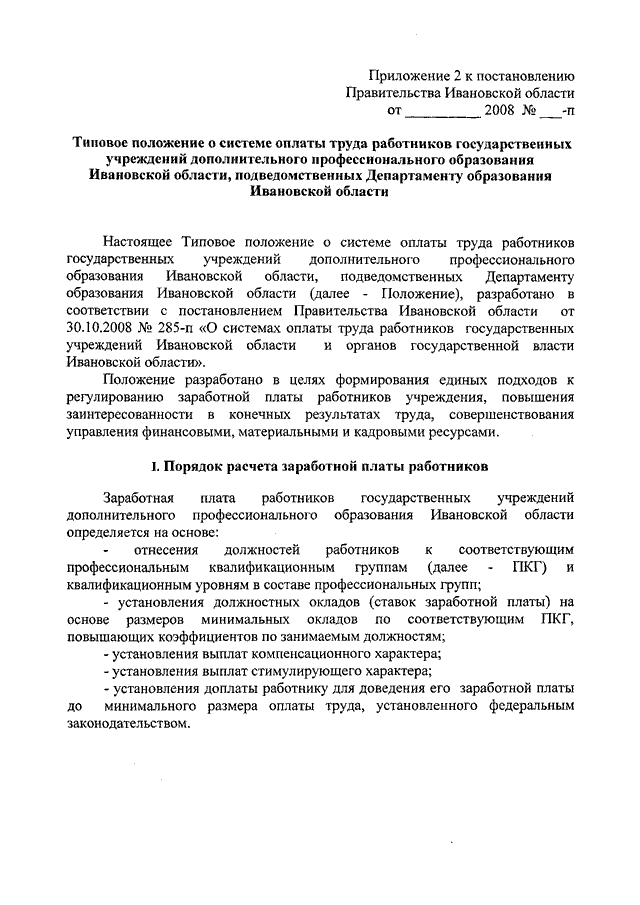 Постановление Правительства Ивановской области от 31.12.2008 N 371-п "О системе оплаты труда работников государственных учреждений Ивановской области, подведомственных Департаменту образования Ивановской области" (вместе с "Типовым положением о системе оплаты труда работников государственных образовательных учреждений Ивановской области и иных государственных учреждений Ивановской области (кроме государственных учреждений дополнительного профессионального образования Ивановской области), подведомственных Департаменту образования Ивановской области", "Типовым положением о системе оплаты труда работников государственных учреждений дополнительного профессионального образования Ивановской области, подведомственных Департаменту образования Ивановской области", "Перечнем должностей работников, относимых к основному персоналу, для расчета средней заработной платы и определения размеров должностных окладов руководителей государственных учреждений Ивановской области, подведомственных Департаменту образования Ивановской области")