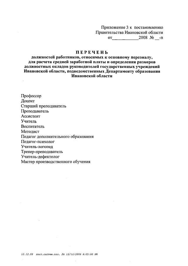Постановление Правительства Ивановской области от 31.12.2008 N 371-п "О системе оплаты труда работников государственных учреждений Ивановской области, подведомственных Департаменту образования Ивановской области" (вместе с "Типовым положением о системе оплаты труда работников государственных образовательных учреждений Ивановской области и иных государственных учреждений Ивановской области (кроме государственных учреждений дополнительного профессионального образования Ивановской области), подведомственных Департаменту образования Ивановской области", "Типовым положением о системе оплаты труда работников государственных учреждений дополнительного профессионального образования Ивановской области, подведомственных Департаменту образования Ивановской области", "Перечнем должностей работников, относимых к основному персоналу, для расчета средней заработной платы и определения размеров должностных окладов руководителей государственных учреждений Ивановской области, подведомственных Департаменту образования Ивановской области")