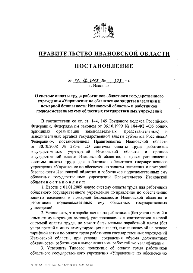 Постановление Правительства Ивановской области от 31.12.2008 N 373-п "О системе оплаты труда работников областного государственного учреждения "Управление по обеспечению защиты населения и пожарной безопасности Ивановской области" и работников подведомственных ему областных государственных учреждений" (вместе с "Типовым положением об оплате труда работников областного государственного учреждения "Управление по обеспечению защиты населения и пожарной безопасности Ивановской области" и работников подведомственных ему областных государственных учреждений")