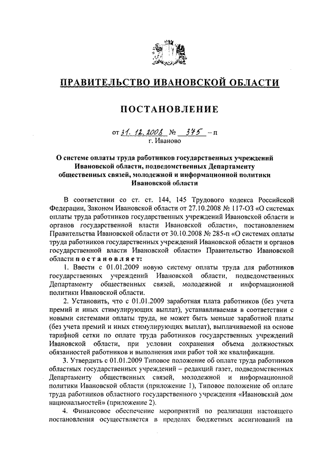 Постановление Правительства Ивановской области от 31.12.2008 N 375-п "О системе оплаты труда работников государственных учреждений Ивановской области, подведомственных Департаменту общественных связей, молодежной и информационной политики Ивановской области" (вместе с "Типовым положением об оплате труда работников областных государственных учреждений - редакций газет, подведомственных Департаменту общественных связей, молодежной и информационной политики Ивановской области", "Типовым положением об оплате труда работников областного государственного учреждения "Ивановский дом национальностей")