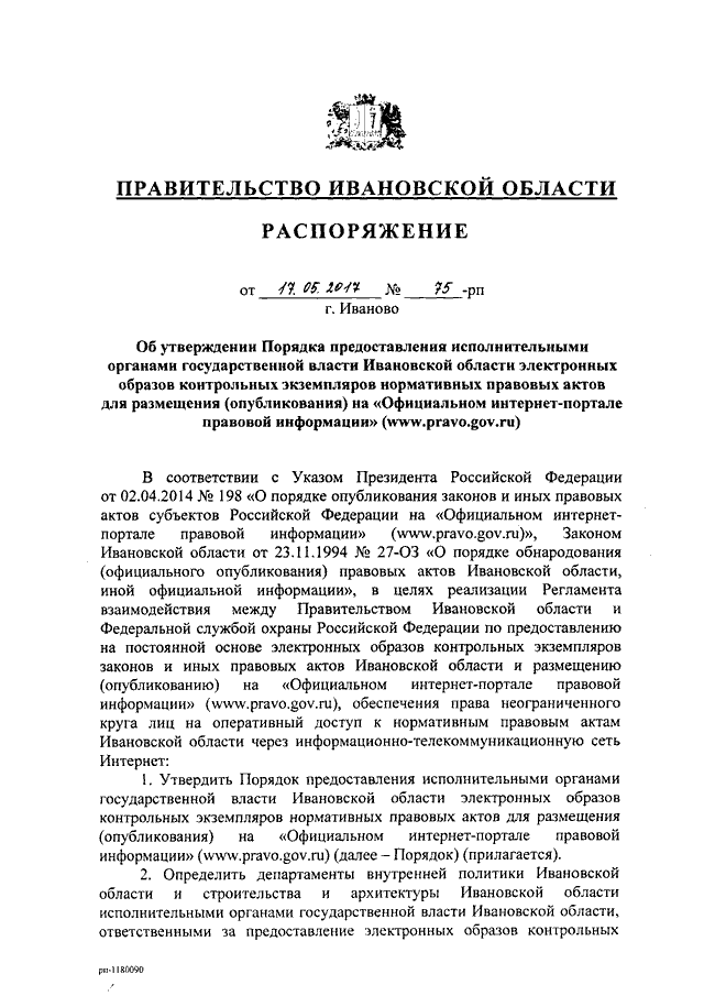 Распоряжение Правительства Ивановской области от 17.05.2017 N 75-рп "Об утверждении Порядка предоставления исполнительными органами государственной власти Ивановской области электронных образов контрольных экземпляров нормативных правовых актов для размещения (опубликования) на "Официальном интернет-портале правовой информации" (www.pravo.gov.ru)"