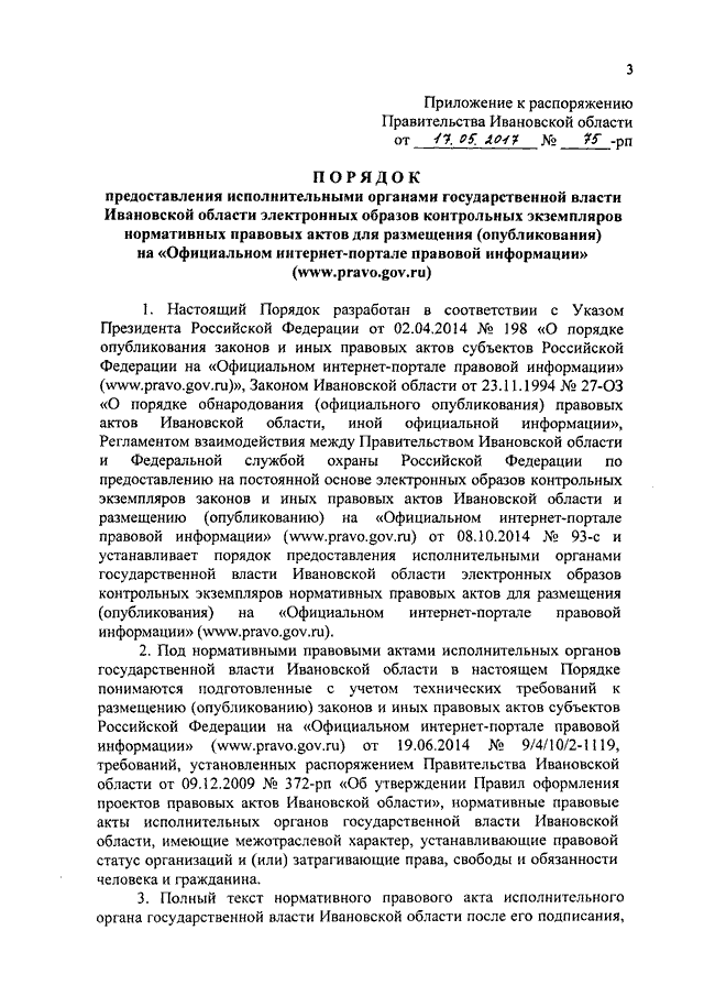 Распоряжение Правительства Ивановской области от 17.05.2017 N 75-рп "Об утверждении Порядка предоставления исполнительными органами государственной власти Ивановской области электронных образов контрольных экземпляров нормативных правовых актов для размещения (опубликования) на "Официальном интернет-портале правовой информации" (www.pravo.gov.ru)"