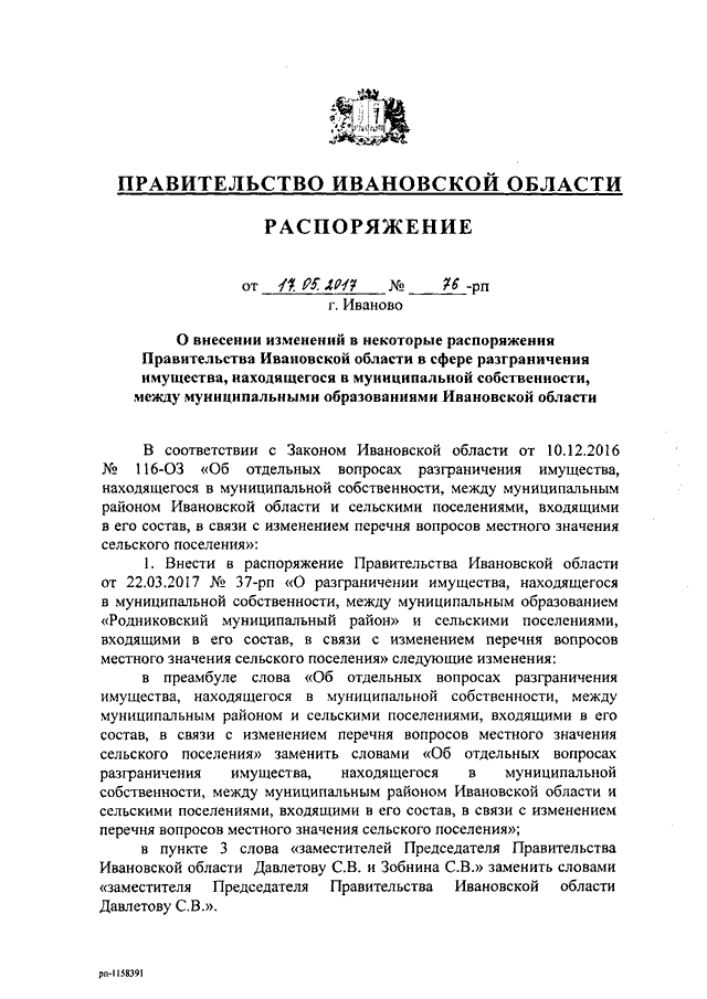 Распоряжение Правительства Ивановской области от 17.05.2017 N 76-рп "О внесении изменений в некоторые распоряжения Правительства Ивановской области в сфере разграничения имущества, находящегося в муниципальной собственности, между муниципальными образованиями Ивановской области"