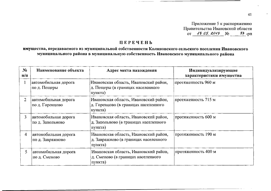 Распоряжение Правительства Ивановской области от 17.05.2017 N 77-рп "О разграничении имущества, находящегося в муниципальной собственности, между Ивановским муниципальным районом и сельскими поселениями, входящими в его состав, в связи с изменением перечня вопросов местного значения сельского поселения"