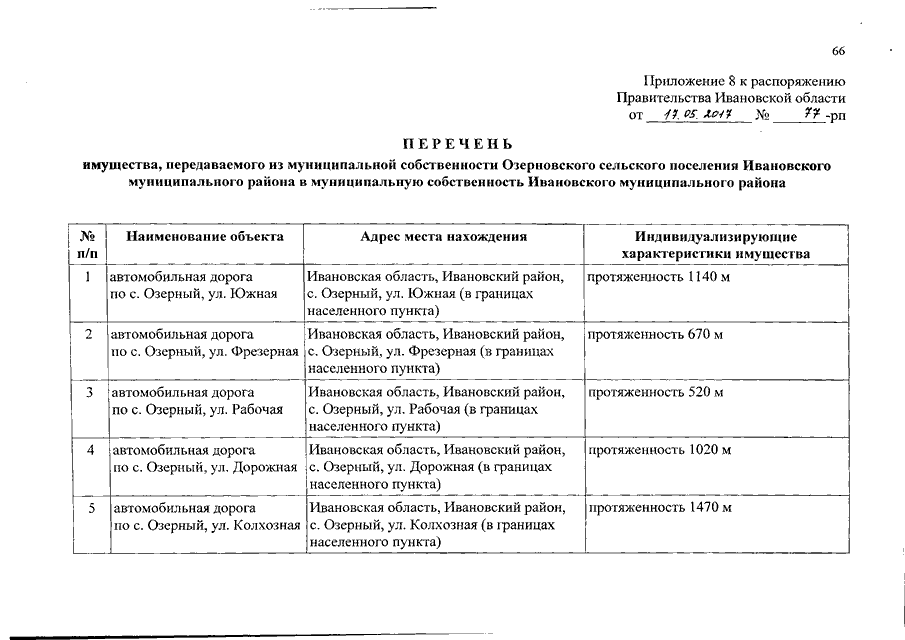 Распоряжение Правительства Ивановской области от 17.05.2017 N 77-рп "О разграничении имущества, находящегося в муниципальной собственности, между Ивановским муниципальным районом и сельскими поселениями, входящими в его состав, в связи с изменением перечня вопросов местного значения сельского поселения"