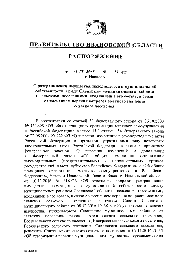 Распоряжение Правительства Ивановской области от 17.05.2017 N 78-рп "О разграничении имущества, находящегося в муниципальной собственности, между Савинским муниципальным районом и сельскими поселениями, входящими в его состав, в связи с изменением перечня вопросов местного значения сельского поселения"