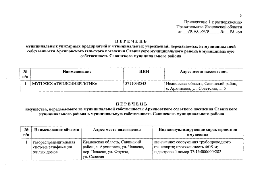 Распоряжение Правительства Ивановской области от 17.05.2017 N 78-рп "О разграничении имущества, находящегося в муниципальной собственности, между Савинским муниципальным районом и сельскими поселениями, входящими в его состав, в связи с изменением перечня вопросов местного значения сельского поселения"
