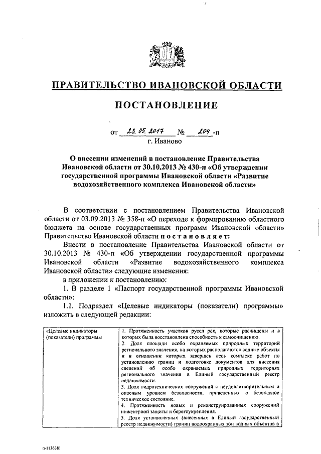 Постановление Правительства Ивановской области от 23.05.2017 N 204-п "О внесении изменений в постановление Правительства Ивановской области от 30.10.2013 N 430-п "Об утверждении государственной программы Ивановской области "Развитие водохозяйственного комплекса Ивановской области"