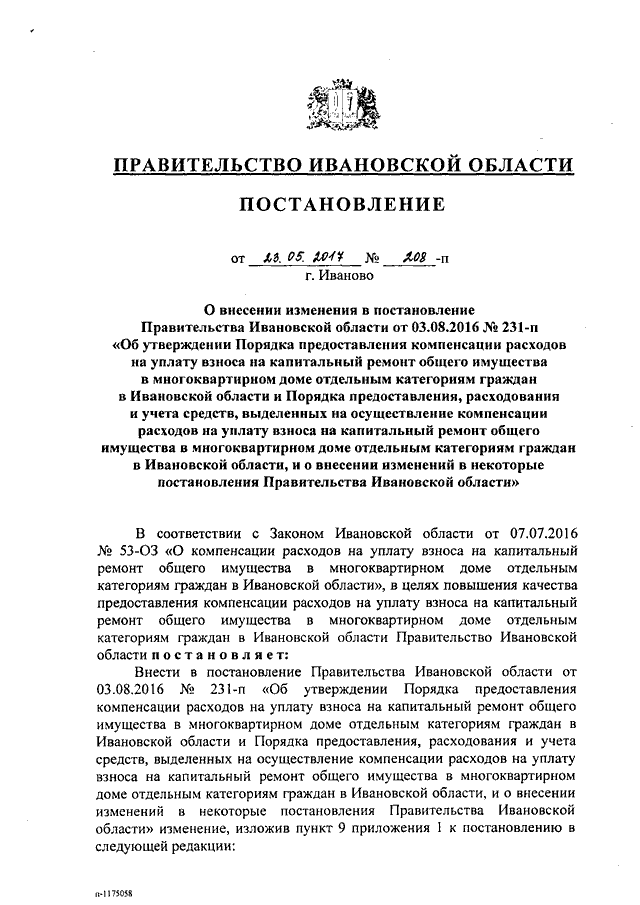 Постановление Правительства Ивановской области от 23.05.2017 N 208-п "О внесении изменения в постановление Правительства Ивановской области от 03.08.2016 N 231-п "Об утверждении Порядка предоставления компенсации расходов на уплату взноса на капитальный ремонт общего имущества в многоквартирном доме отдельным категориям граждан в Ивановской области и Порядка предоставления, расходования и учета средств, выделенных на осуществление компенсации расходов на уплату взноса на капитальный ремонт общего имущества в многоквартирном доме отдельным категориям граждан в Ивановской области, и о внесении изменений в некоторые постановления Правительства Ивановской области"