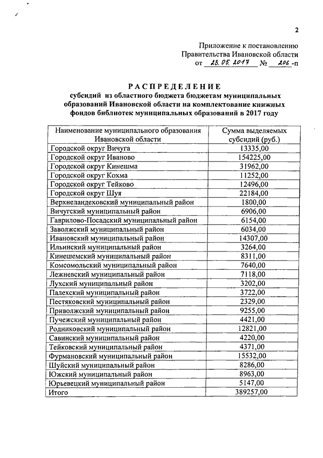 Постановление Правительства Ивановской области от 23.05.2017 N 206-п "О распределении субсидий из областного бюджета бюджетам муниципальных образований Ивановской области на комплектование книжных фондов библиотек муниципальных образований в 2017 году"