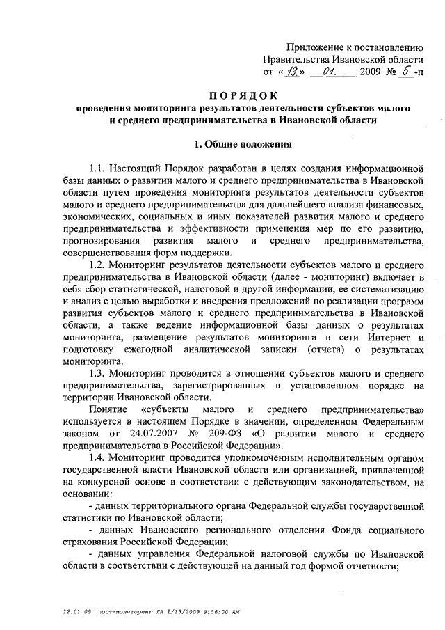 Постановление Правительства Ивановской области от 19.01.2009 N 5-п "О Порядке проведения мониторинга результатов деятельности субъектов малого и среднего предпринимательства в Ивановской области"