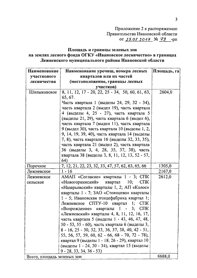 Распоряжение Правительства Ивановской области от 23.05.2017 N 79-рп "Об установлении площадей и границ лесопарковых зон и зеленых зон на землях лесного фонда ОГКУ "Ивановское лесничество" в границах Лежневского муниципального района Ивановской области"