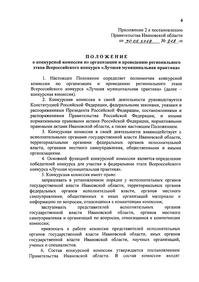 Постановление Правительства Ивановской области от 30.05.2017 N 212-п "О проведении регионального этапа Всероссийского конкурса "Лучшая муниципальная практика" (вместе с "Положением о проведении регионального этапа Всероссийского конкурса "Лучшая муниципальная практика", "Положением о конкурсной комиссии по организации и проведению регионального этапа Всероссийского конкурса "Лучшая муниципальная практика")