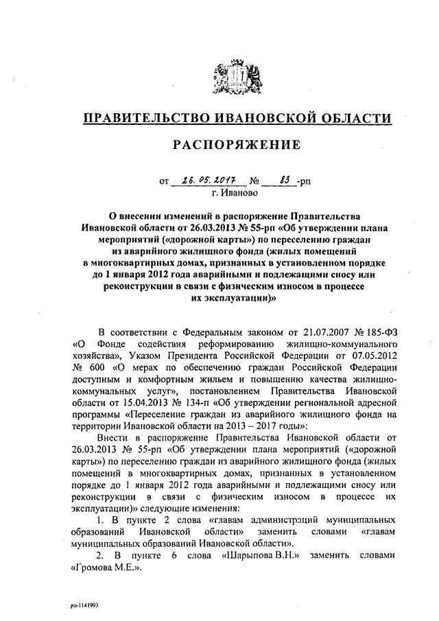 Распоряжение Правительства Ивановской области от 26.05.2017 N 83-рп "О внесении изменений в распоряжение Правительства Ивановской области от 26.03.2013 N 55-рп "Об утверждении плана мероприятий ("дорожной карты") по переселению граждан из аварийного жилищного фонда (жилых помещений в многоквартирных домах, признанных в установленном порядке до 1 января 2012 года аварийными и подлежащими сносу или реконструкции в связи с физическим износом в процессе их эксплуатации)"