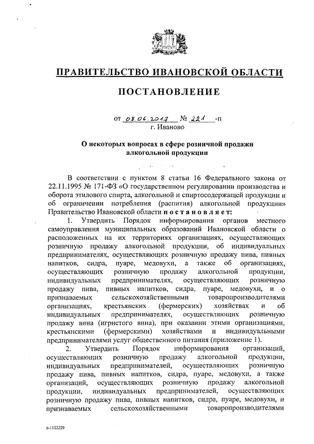 Постановление Правительства Ивановской области от 08.06.2017 N 221-п "О некоторых вопросах в сфере розничной продажи алкогольной продукции" (вместе с "Порядком информирования органов местного самоуправления муниципальных образований Ивановской области о расположенных на их территориях организациях, осуществляющих розничную продажу алкогольной продукции, об индивидуальных предпринимателях, осуществляющих розничную продажу пива, пивных напитков, сидра, пуаре, медовухи, а также об организациях, осуществляющих розничную продажу алкогольной продукции, индивидуальных предпринимателях, осуществляющих розничную продажу пива, пивных напитков, сидра, пуаре, медовухи, и о признаваемых сельскохозяйственными товаропроизводителями организациях, крестьянских (фермерских) хозяйствах и об индивидуальных предпринимателях, осуществляющих розничную продажу вина (игристого вина), при оказании этими организациями, крестьянскими (фермерскими) хозяйствами и индивидуальными предпринимателями услуг общественного питания", "Порядком информирования организаций, осуществляющих розничную продажу алкогольной продукции, индивидуальных предпринимателей, осуществляющих розничную продажу пива, пивных напитков, сидра, пуаре, медовухи, а также организаций, осуществляющих розничную продажу алкогольной продукции, индивидуальных предпринимателей, осуществляющих розничную продажу пива, пивных напитков, сидра, пуаре, медовухи, и признаваемых сельскохозяйственными товаропроизводителями организаций, крестьянских (фермерских) хозяйств и индивидуальных предпринимателей, осуществляющих розничную продажу вина (игристого вина), при оказании этими организациями, крестьянскими (фермерскими) хозяйствами и индивидуальными предпринимателями услуг общественного питания на территории Ивановской области об издании муниципального правового акта об определении границ прилегающих территорий, указанных в подпункте 10 пункта 2 статьи 16 Федерального закона от 22.11.1995 N 171-ФЗ "О государственном регулировании производства и оборота этилового спирта, алкогольной и спиртосодержащей продукции и об ограничении потребления (распития) алкогольной продукции")