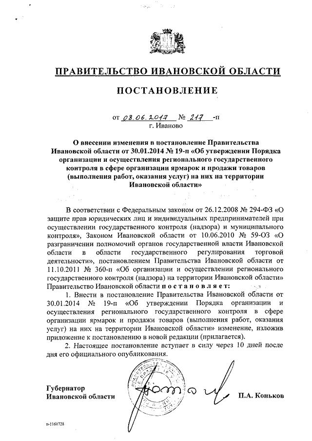 Постановление Правительства Ивановской области от 08.06.2017 N 217-п "О внесении изменения в постановление Правительства Ивановской области от 30.01.2014 N 19-п "Об утверждении Порядка организации и осуществления регионального государственного контроля в сфере организации ярмарок и продажи товаров (выполнения работ, оказания услуг) на них на территории Ивановской области"