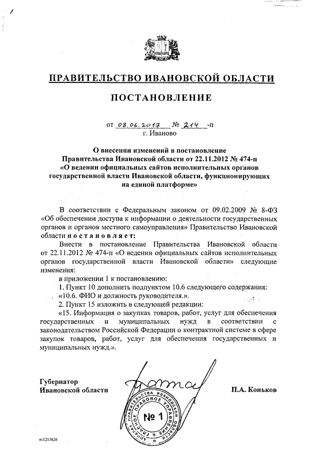 Постановление Правительства Ивановской области от 08.06.2017 N 214-п "О внесении изменений в постановление Правительства Ивановской области от 22.11.2012 N 474-п "О ведении официальных сайтов исполнительных органов государственной власти Ивановской области, функционирующих на единой платформе"