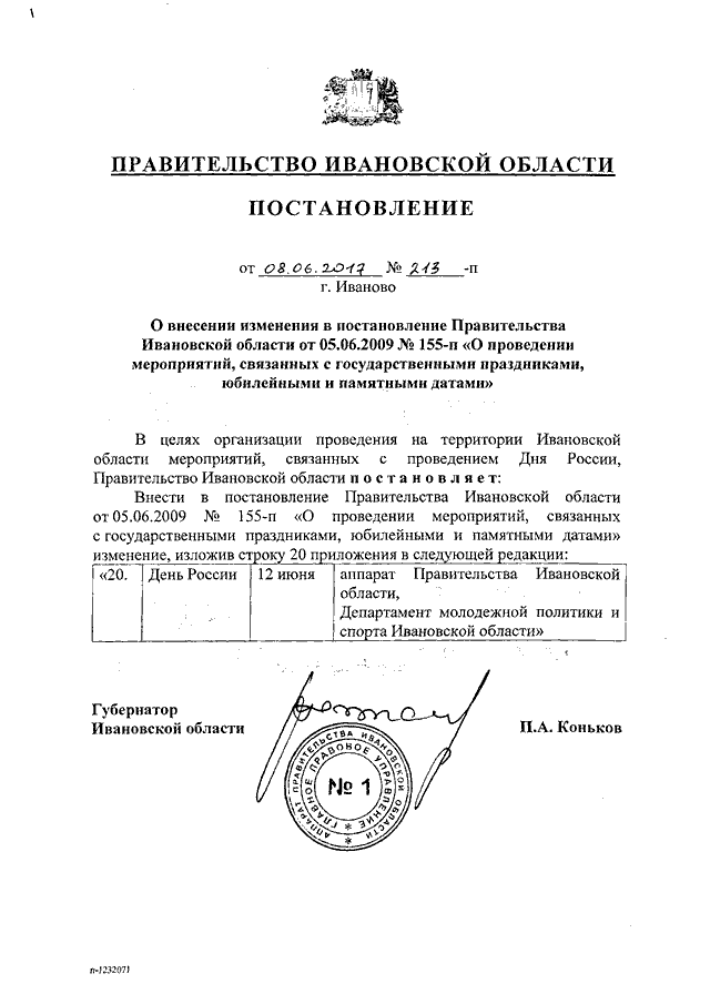 Постановление Правительства Ивановской области от 08.06.2017 N 213-п "О внесении изменения в постановление Правительства Ивановской области от 05.06.2009 N 155-п "О проведении мероприятий, связанных с государственными праздниками, юбилейными и памятными датами"