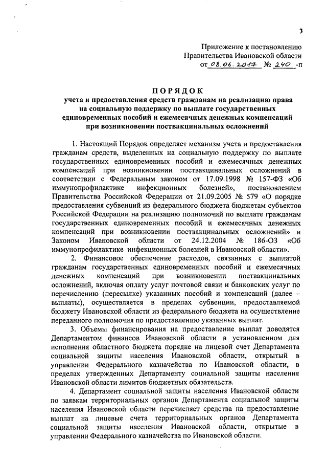 Постановление Правительства Ивановской области от 08.06.2017 N 240-п "О Порядке учета и предоставления средств гражданам на реализацию права на социальную поддержку по выплате государственных единовременных пособий и ежемесячных денежных компенсаций при возникновении поствакцинальных осложнений"