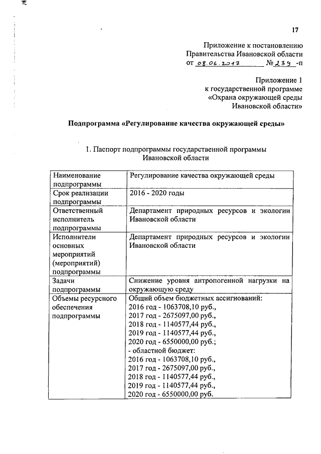 Постановление Правительства Ивановской области от 08.06.2017 N 239-п "О внесении изменений в постановление Правительства Ивановской области от 13.11.2013 N 452-п "Об утверждении государственной программы Ивановской области "Охрана окружающей среды Ивановской области" (вместе с "Подпрограммой "Регулирование качества окружающей среды")