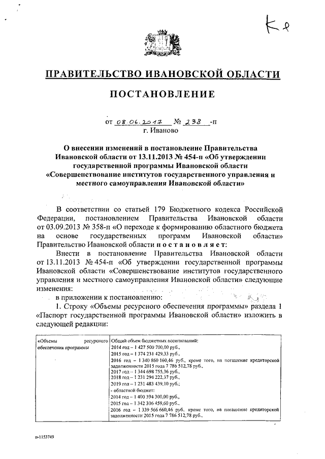 Постановление Правительства Ивановской области от 08.06.2017 N 238-п "О внесении изменений в постановление Правительства Ивановской области от 13.11.2013 N 454-п "Об утверждении государственной программы Ивановской области "Совершенствование институтов государственного управления и местного самоуправления Ивановской области"