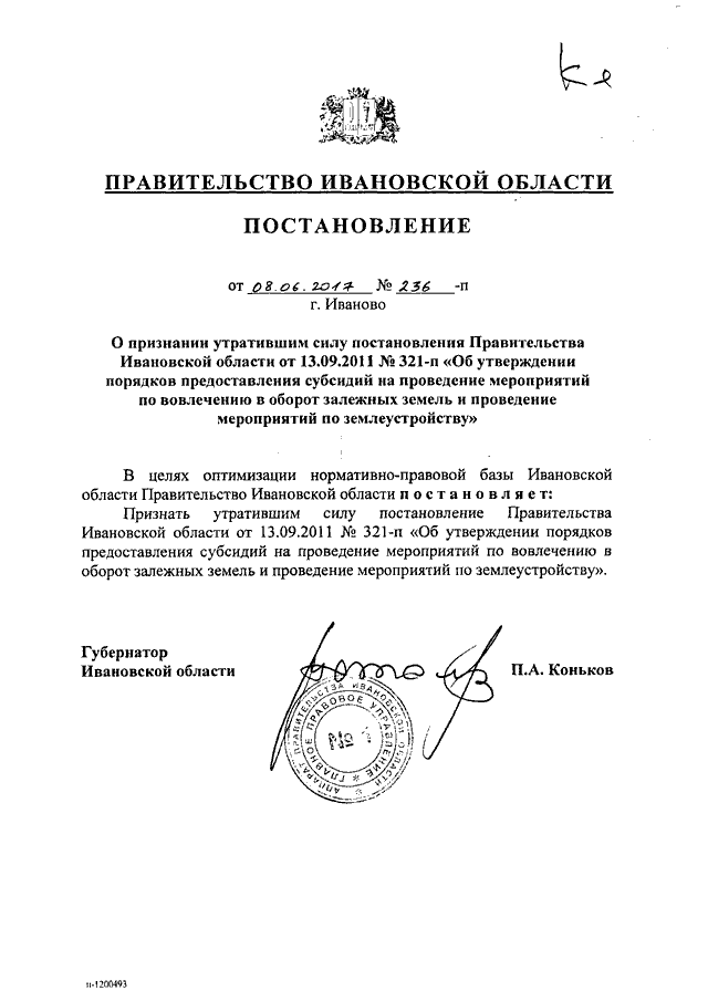 Постановление Правительства Ивановской области от 08.06.2017 N 236-п "О признании утратившим силу постановления Правительства Ивановской области от 13.09.2011 N 321-п "Об утверждении порядков предоставления субсидий на проведение мероприятий по вовлечению в оборот залежных земель и проведение мероприятий по землеустройству"