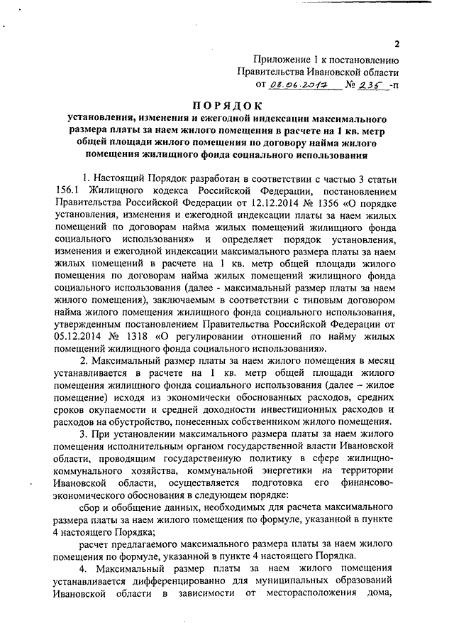 Постановление Правительства Ивановской области от 08.06.2017 N 235-п "Об утверждении Порядка установления, изменения и ежегодной индексации максимального размера платы за наем жилого помещения в расчете на 1 кв. метр общей площади жилого помещения по договору найма жилого помещения жилищного фонда социального использования"