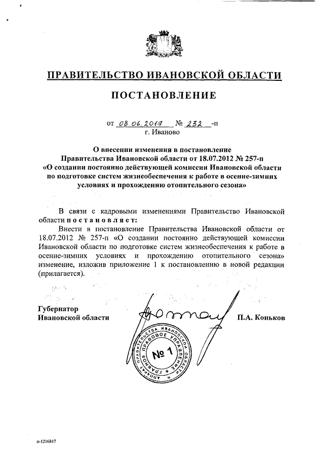 Постановление Правительства Ивановской области от 08.06.2017 N 232-п "О внесении изменения в постановление Правительства Ивановской области от 18.07.2012 N 257-п "О создании постоянно действующей комиссии Ивановской области по подготовке систем жизнеобеспечения к работе в осенне-зимних условиях и прохождению отопительного сезона"
