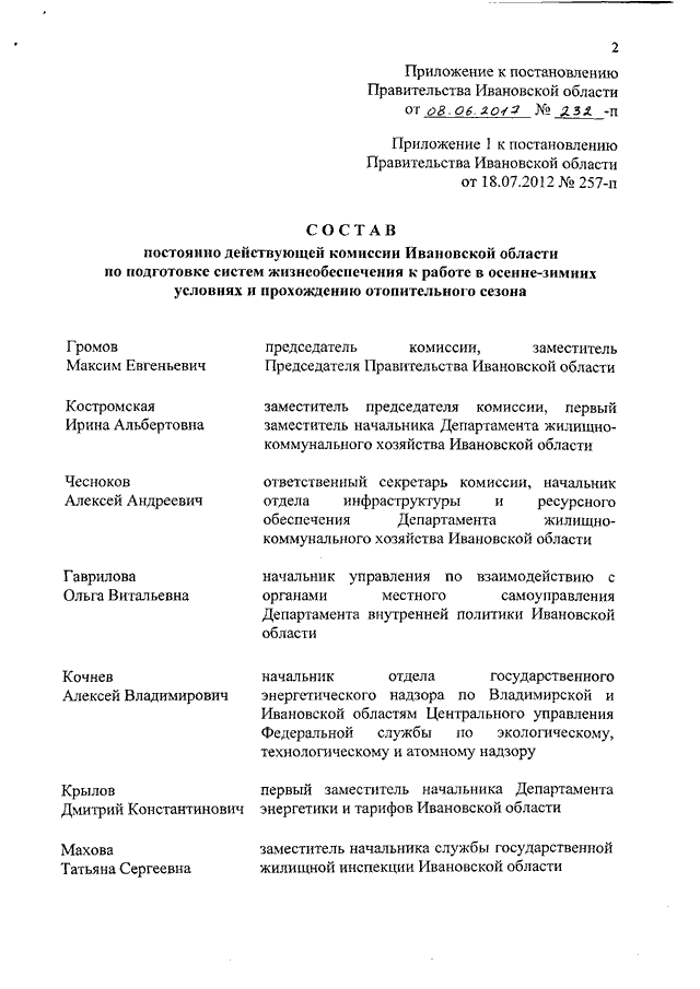 Постановление Правительства Ивановской области от 08.06.2017 N 232-п "О внесении изменения в постановление Правительства Ивановской области от 18.07.2012 N 257-п "О создании постоянно действующей комиссии Ивановской области по подготовке систем жизнеобеспечения к работе в осенне-зимних условиях и прохождению отопительного сезона"