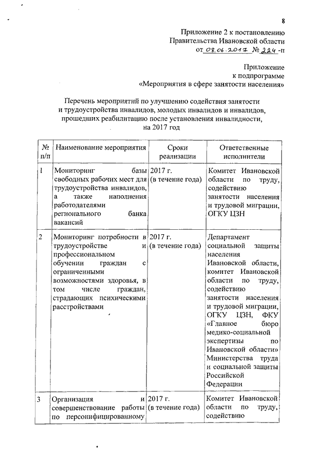 Постановление Правительства Ивановской области от 08.06.2017 N 224-п "О внесении изменений в постановление Правительства Ивановской области от 09.07.2013 N 279-п "Об утверждении государственной программы Ивановской области "Содействие занятости населения Ивановской области" (вместе с "Перечнем мероприятий по улучшению содействия занятости и трудоустройства инвалидов, молодых инвалидов и инвалидов, прошедших реабилитацию после установления инвалидности, на 2017 год")