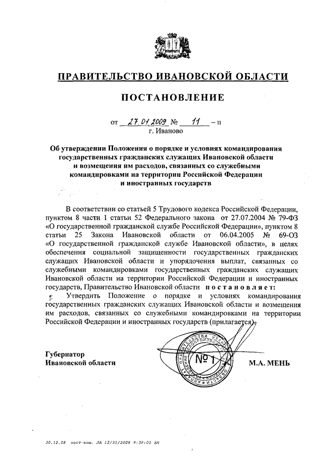 Постановление Правительства Ивановской области от 27.01.2009 N 11-п "Об утверждении Положения о порядке и условиях командирования государственных гражданских служащих Ивановской области и возмещения им расходов, связанных со служебными командировками на территории Российской Федерации и иностранных государств"