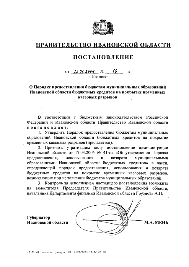 Постановление Правительства Ивановской области от 28.01.2009 N 16-п "О Порядке предоставления бюджетам муниципальных образований Ивановской области бюджетных кредитов на покрытие временных кассовых разрывов"