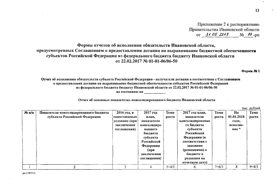 Распоряжение Правительства Ивановской области от 31.05.2017 N 86-рп "О мерах по реализации Соглашения о предоставлении дотации на выравнивание бюджетной обеспеченности субъектов Российской Федерации из федерального бюджета бюджету Ивановской области" (вместе с "Планом мероприятий по реализации Соглашения о предоставлении дотации на выравнивание бюджетной обеспеченности субъектов Российской Федерации из федерального бюджета бюджету Ивановской области от 22.02.2017 N 01-01-06/06-50")