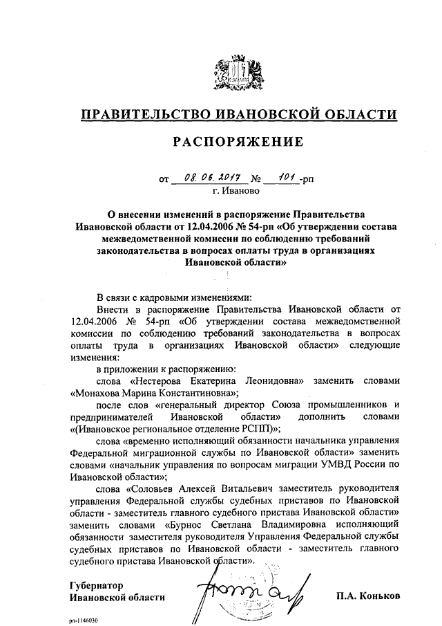 Распоряжение Правительства Ивановской области от 08.06.2017 N 101-рп "О внесении изменений в распоряжение Правительства Ивановской области от 12.04.2006 N 54-рп "Об утверждении состава межведомственной комиссии по соблюдению требований законодательства в вопросах оплаты труда в организациях Ивановской области"