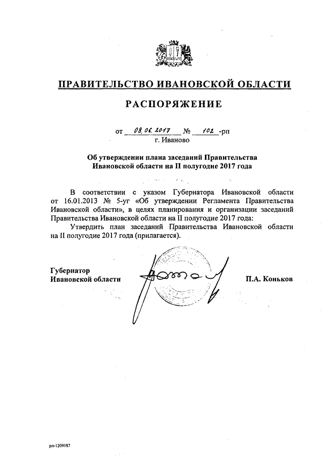 Распоряжение Правительства Ивановской области от 08.06.2017 N 102-рп "Об утверждении плана заседаний Правительства Ивановской области на II полугодие 2017 года"