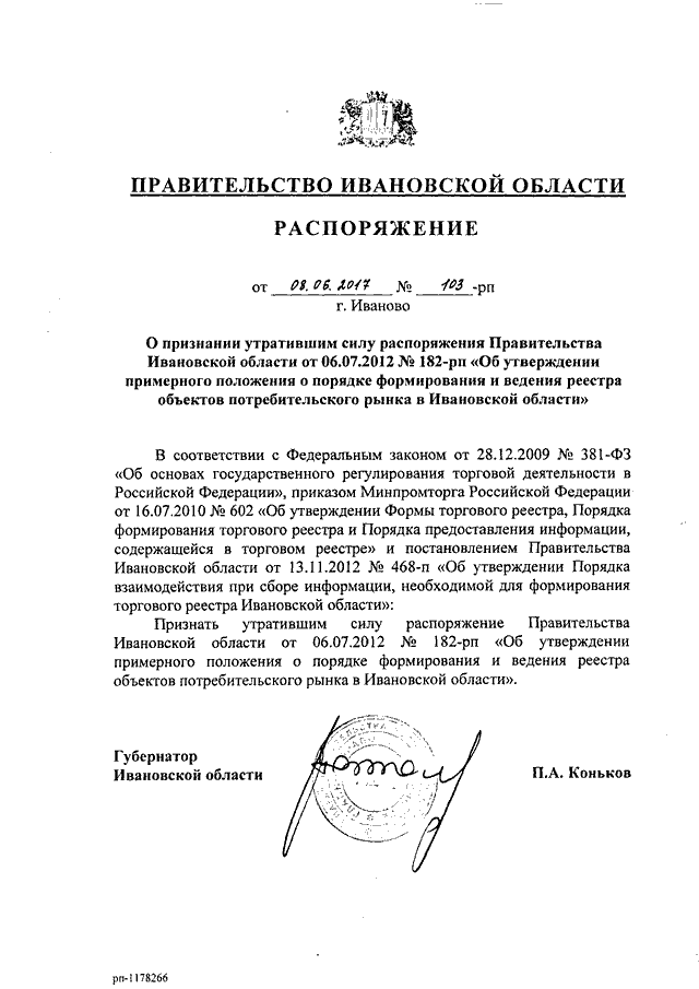 Распоряжение Правительства Ивановской области от 08.06.2017 N 103-рп "О признании утратившим силу распоряжения Правительства Ивановской области от 06.07.2012 N 182-рп "Об утверждении примерного положения о порядке формирования и ведения реестра объектов потребительского рынка в Ивановской области"