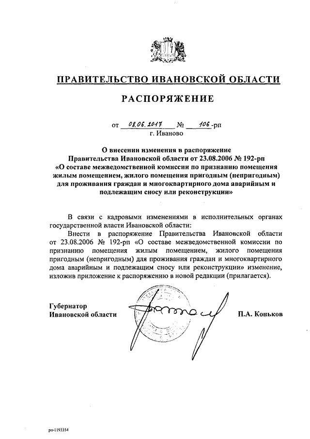 Распоряжение Правительства Ивановской области от 08.06.2017 N 106-рп "О внесении изменения в распоряжение Правительства Ивановской области от 23.08.2006 N 192-рп "О составе межведомственной комиссии по признанию помещения жилым помещением, жилого помещения пригодным (непригодным) для проживания граждан и многоквартирного дома аварийным и подлежащим сносу или реконструкции"