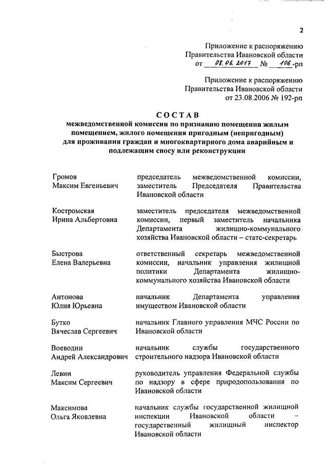 Распоряжение Правительства Ивановской области от 08.06.2017 N 106-рп "О внесении изменения в распоряжение Правительства Ивановской области от 23.08.2006 N 192-рп "О составе межведомственной комиссии по признанию помещения жилым помещением, жилого помещения пригодным (непригодным) для проживания граждан и многоквартирного дома аварийным и подлежащим сносу или реконструкции"